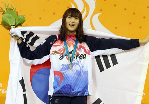 | ◇정다래가 17일 중국 광저우 아오티 아쿠아틱센터에서 열린 광저우 아시안게임 여자 수영 200m 평영에서 정상에 오른 뒤 태극기를 두른 채 시상대에 올라 밝게 웃고 있다. 광저우=연합뉴스 |