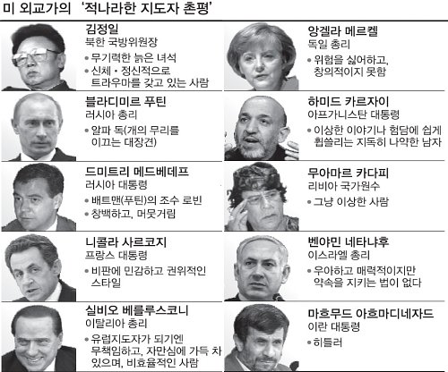 예멘의 알리 압둘라 살레 대통령은 “남을 무시하길 잘하고 지루하게 만들며 또 참을성이 없다”고 보고됐다. 리비아 지도자 무아마르 카다피는 “그냥 이상한 사람”으로, 베냐민 네타냐후 이스라엘 총리는 “우아하고 매력적이지만 약속을 결코 안 지키는 사람”으로 묘사됐다.
