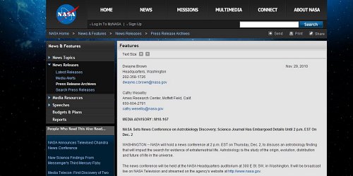 나사는 지난달 29일 홈페이지를 통해 "우주생물학적인 발견에 대해 기자 회견을 준비하며 과학관련 언론은 12월2일 오후 2시(현지시간)까지 세부내용에 대한 배포를 금지한다"라는 글을 게재했다.