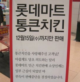 | ◇13일 롯데마트 서울역점 식품매장에 ‘통큰 치킨’ 판매 중단 안내판이 설치돼 있다. |