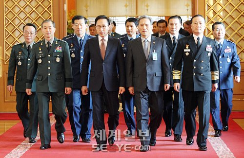 | ◇이명박 대통령이 16일 청와대에서 김상기 육군참모총장(앞줄 왼쪽) 등 신임 고위 장성 14명의 승진 및 보직 신고를 받은 뒤 김관진 국방장관(앞줄 오른쪽 두 번째)과 함께 간담회장으로 이동하고 있다. 남제현 기자 |