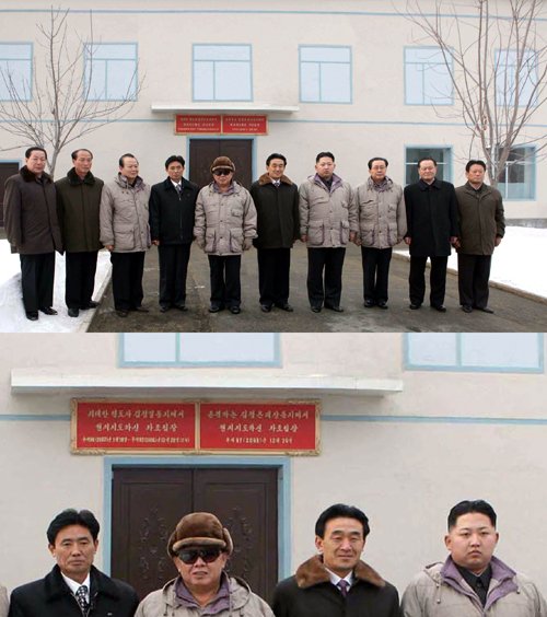 | ◇김정은 2년 전 현지지도? 북한 조선중앙통신이 22일 보도한 김정일 국방위원장의 희천청년전기연합기업소 시찰 사진(위)과 배경 건물의 현판 부분을 확대한 사진(아래). 오른쪽 현판에는 ‘존경하는 김정은 대장동지께서 현지지도하신 차조립장 주체 97(2008년) 12월’이라고 적혀 있지만, 건물의 2층 유리창이 페인트로 그려진 것이 분명해 현판도 김정은의 지도경험을 부풀리기 위해 최근에 만든 것이 아니냐는 의혹이 제기되고 있다. 연합뉴스 |