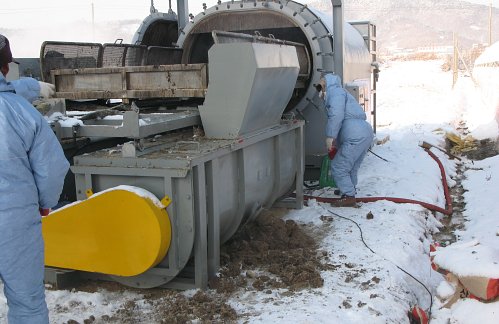 | ◇천안시 풍세면 AI 발생 농장에서 열처리 방식의 폐사가축 처리기가 살처분한 오리 사체를 퇴비로 만들어 배출하고 있다. 1회 처리용량이 2t인 이 장비는 1회 가동에 3시간가량이 소요된다. 천안=김정모 기자 |