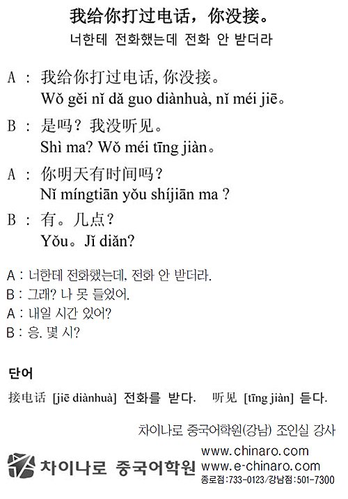 [生生 중국어 한마디] 너한테 전화했는데 전화 안 받더라 입력 : 2011-01-12 17:30:08 수정 : 2011-01-12 17:30:08 구글 네이버 유튜브 Copyright ⓒ 세계일보. 무단 전재 및 재배포 금지 세계일보