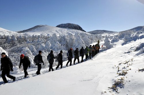 제주도는 여느 때 찾아가도 신비스럽다. 겨울 한라산은 더 그렇다. 산 위는 온통 흰 눈으로 덮여 ‘설국’을 이루고, 낮은 곳에선 작은 풀들이 싹이 틔운다. 산에 오르면 겨울이고, 내려오면 벌써 봄이 느껴진다. 이맘때 한라산에 가면 단지 ‘아름답다’는 말만으로 설명할 수 없는 환상적인 설경을 만날 수 있다. 눈이 수북이 쌓인 등산길을 걸으면 한라산이 우리나라 유일의 세계자연유산으로 지정된 이유를 알 것만 같다. 한라산에는 어리목·영실·돈내코·성판악·관음사 등 5개 등산 코스가 있다.