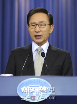 | ◇이명박 대통령이 21일 청와대 춘추관에서 삼호주얼리호 구출작전 성공과 관련한 담화를 발표하고 있다. 남제현 기자 |