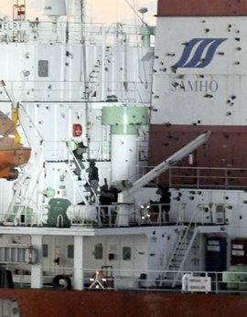 | ◇격전의 흔적들 청해부대 특수전요원들이 21일 수백개의 총탄자국이 선명한 삼호주얼리호로 진입하고 있다. 이 총탄 자국들은 함포 위협사격에 이어 해적들의 시선을 분산시키기 위해 링스헬기에서 발사한 K-6 기관총 흔적인 것으로 보인다. 해군 제공 |