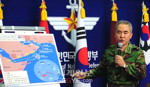 | ◇작전 브리핑 21일 청해부대 특수전요원들의 전격적인 삼호주얼리호 선원 구출작전이 성공적으로 종료된 뒤 이성호 합참 군사지원본부장이 서울 용산 국방부에서 작전에 대해 브리핑하고 있다. 남제현 기자 |