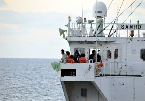 | ◇선원 구출 21일 아라비아해에서 청해부대의 ‘아덴만 여명’ 작전이 종료된 뒤 UDT 작전팀에 구출된 삼호주얼리호 선원들이 외부갑판에서 바다를 바라보고 있다. 해군 제공 |