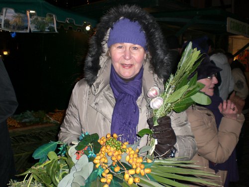| 크리스마스 시장에서 구입한 마늘이 꽃으로 장신된 다발을 자랑스럽게 들고 있다. |