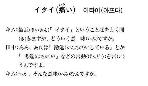 ‘イタイ’는 원래 ‘아픔’을 뜻하는 말이지만 최근에는 언동에 대해 많이 사용되고 있다. 구체적으로는 엉뚱한 언동을 했을 때 창피하다, 한심하다라는 뜻으로 イタイ를 쓴다.