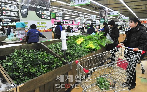 | ◇지난달 생활필수품 10개 중 7개 가격이 오른 가운데 13일 서울의 한 대형마트를 찾은 한 시민이 신선식품 매장에서 물건을 고르고 있다. 송원영 기자 |