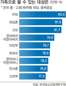 한국청소년정책연구원이 지난해 6∼7월 중·고교생 6979명을 대상으로 설문조사한 결과 박군처럼 청소년들은 친가보다 외가에 친밀감을 느끼는 것으로 조사됐다.