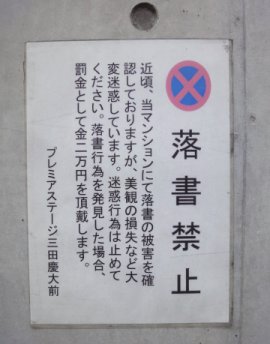 | ◇어느 건물 벽에 붙여진 ‘낙서 금지’ 표지판. 일본어를 몰라도 “낙서 행위에 따른 피해가 발생하고 있는 바, 미관을 해치는 낙서를 행하다가 발견될 경우에는 벌금 2만엔을 물린다”는 내용임을 짐작할 수 있다. 한자를 모르는 외국인들에겐 ‘검은 것은 종이요, 흰 것은 글씨’에 불과하겠지만. |