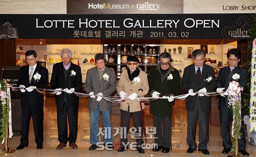 소공동 롯데호텔서울 본관 1층에서 개관식 세리머니로 거행된 테이프 커팅식에서 좌상봉 롯데호텔 대표이사(왼쪽부터), 황용업 화백, 백영수 화백, 김종하 화백, 권옥연 화백, 윤명로 화백, 심정택 비컨갤러리 대표가 테이프 커팅을 하고 있다. (사진=롯데호텔 제공)