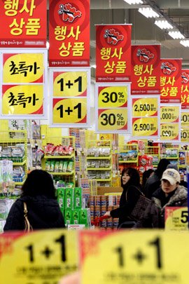 | ◇3일 생필품 할인행사가 열리고 있는 서울 시내 한 대형마트에서 주부들이 물건을 고르고 있다. 연합뉴스 |