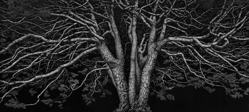 초기엔 먹과 목탄을 함께 사용했어요 그러다 점차 목탄으로 기울었고 목탄이 저의 작품과 궁합이 맞았어요 사실 목탄은 검은색이 아닌 검은공간입니다 이것은 드로잉의 재료가 아닌 회화입니다 목탄은 나무를 태워서 숲을 환생시키는 영혼으로서의 표현체입니다 사실 제가 주목하는 것은 사물 자체가 아니라 사물과 사물 사이 그 고유한 형상의 바깥(너머)이 만들어 내는 빈 공간입니다 그 어둠 그 여백 보이지 않지만 그 안에 비경이 있습니다 일종의 초월일 것입니다 달빛에 비쳐진 소나무의 신령한 존재가 드러나는데 달의 빛 달의 소리와 음혈이 그 안에 있기 때문입니다