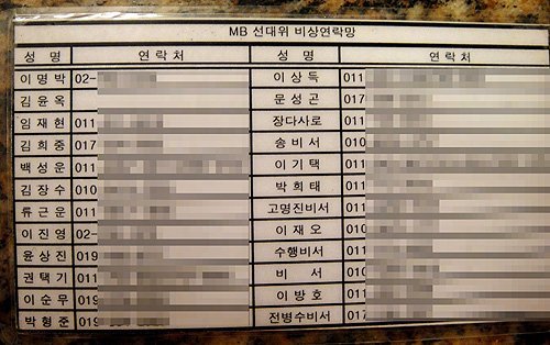 MB(이명박 대통령을 지칭) 선대위 비상연락망이라는 이름이 붙은 자료에는 이 대통령은 물론 대통령 형인 한나라당 이상득 의원 현 정부 실세로 불리는 이재오 특임장관과 이방호 지방분권촉진위원장 등의 휴대전화 번호를 비롯한 연락처가 망라돼 있다 한나라당 정두언 장광근 이춘식 현경병 이범래 김동성 홍준표 박진 정태근 권영진 이성현 이혜훈 의원 등의 번호도 적혀 있다