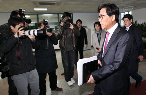 | ◇일명 ‘상하이 스캔들’을 조사하고 있는 국무총리실 공직복무관리관실의 류충렬(오른쪽에서 두번째) 관리관이 9일 서울 종로구 창성동 정부중앙청사 별관에서 김정기 전 상하이 총영사를 조사하기 위해 사무실로 걸어가고 있다. 연합뉴스 |