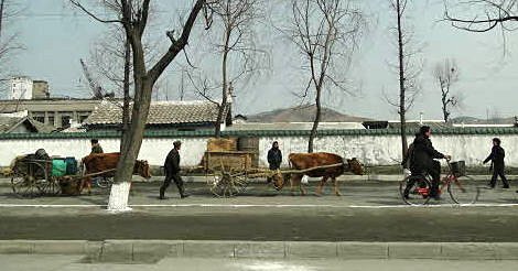 | ◇원산시내 소 달구지 북한 원산시에서 주민들이 소 달구지를 끌고 거리를 지나가는 모습. 마틴 유든 주한 영국대사는 지난 11일부터 나흘간 평양과 원산을 방문한 뒤 자신의 블로그에 방북소감문과 함께 이 사진을 올렸다. 유든 대사 블로그 |