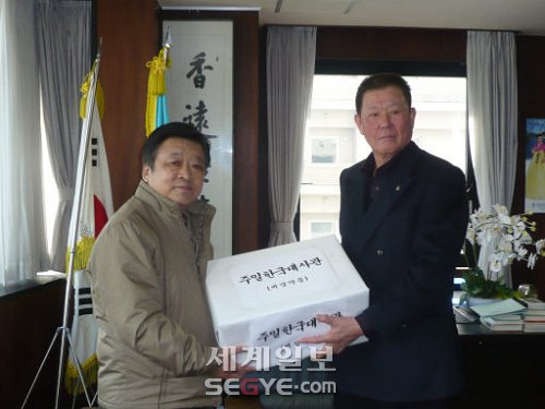 | ◇권철현(왼쪽) 주일 한국대사가 27일 강진과 쓰나미로 피해를 입은 일본 미야기현 센다이를 방문해 김성의 이와테현 재일본대한민국민단 지부 단장에게 구급의약품을 전달하고 있다. 센다이=김동진 특파원 |