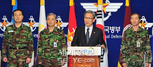 | ◇곤혹스런 국방부 예비역 장성들이 ‘국방개혁 307계획’에 강력히 반발해 파문이 일고 있다. 사진은 김관진 국방장관이 지난 8일 서울 용산구 국방부 브리핑룸에서 군 수뇌부가 배석한 가운데 ‘국방개혁 307계획’을 발표하는 모습. 왼쪽부터 김성찬 해군참모총장, 한민구 합참의장, 김 장관, 김상기 육군참모총장. 세계일보 자료사진 |