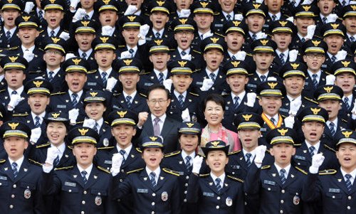 지난달 29일 경기도 용인시 경찰대에서 열린 제27기 졸업식에서 이명박 대통령 내외가 졸업생들과 파이팅을 외치고 있다.
