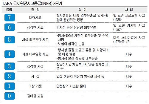 가장 심각한 등급인 7등급은 ‘대형사고(Major Accident)’로, ‘방사성물질의 대량 유출로 인체와 환경에 광범위한 피해가 발생해 계획적·장기적인 대응 조치가 요구되는 단계’다. 지금까지는 역사상 최악의 원전 사고는 1986년 옛 소련의 체르노빌 사고로 유일하게 7등급으로 분류됐다. 체르노빌 사고 때는 원자로가 폭발하면서 노심의 방사성물질이 대량 확산돼 사고 직후 56명이 숨지고 이후 수천명이 방사선 피폭 후유증으로 사망했다.