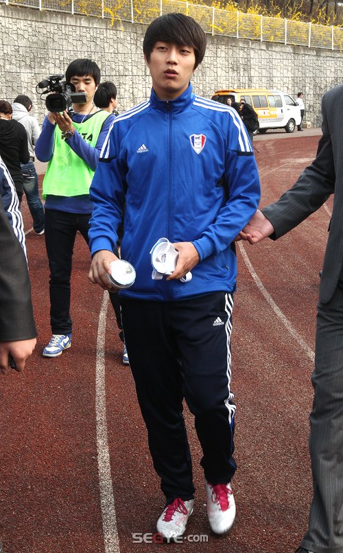 15일 오후 경기도 수원 월드컵경기장 내 보조경기장에서 열리는 2011 스타피스컵 연예인 축구대회에 참가하는 FC 맨(가수팀)의 윤두준이 입장하고 있다.