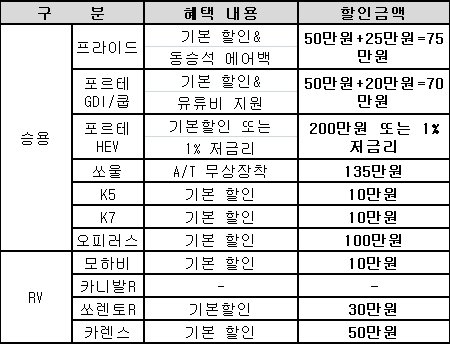 기아차의 5월 구입 혜택은 포르테 하이브리드 모델 구입 고객에게 지원했던 290만원의 지원금이 200만원으로 줄어든 것을 제외하면 지난 4월과 동일하다.