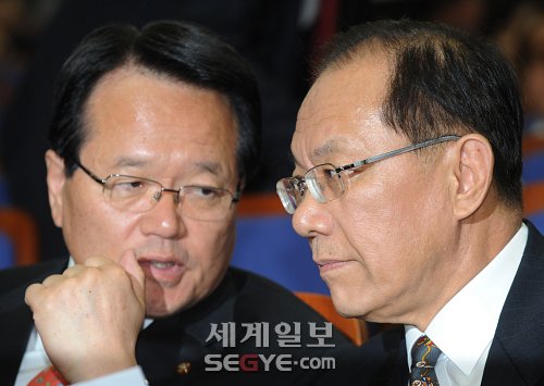 | 역할 분담 한나라당 황우여(오른쪽) 원내대표와 정의화 비상대책위원장이 11일 오후 국회에서 열린 의원총회에서 심각한 표정으로 얘기를 나누고 있다. 이범석 기자 |