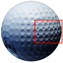| 공기역학 원리를 이용해 직진성향을 강화한 폴라라 골프볼. 가운데 딤플이 깊게 만들어졌으며, 딤플 주변에 작은 딤플을 추가로 만들어 놓았다. |