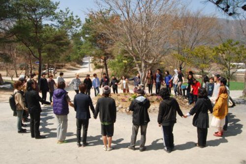 | ◇금산간디학교 후배들은 지난달 변선진의 1주기를 맡아 수목장을 한 그의 나무 앞에서 추모식을 가졌다. |