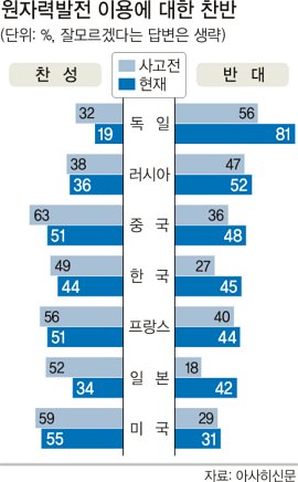 신문에 따르면 한국은 반대 45% 찬성 44%, 독일은 반대 81% 찬성 19%, 러시아는 반대 52% 찬성 36%, 일본은 반대 42% 찬성 34%였다. 반면 미국과 프랑스는 여전히 원전 찬성 여론이 높았다.