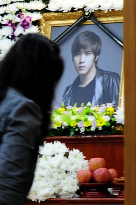 | 27일 서울 종로구 연건동 서울대학병원 장례식장에 마련된 SG워너비 전 멤버 채동하의 빈소에서 한 조문객이 조문하고 있다. 사진공동취재단 |