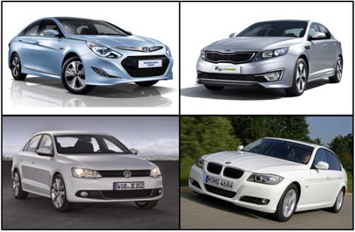 ▲ 쏘나타 하이브리드, K5 하이브리드, BMW 320d 이피션트다이내믹스 에디션, 폭스바겐 제타 (좌측상단에서 시계방향)