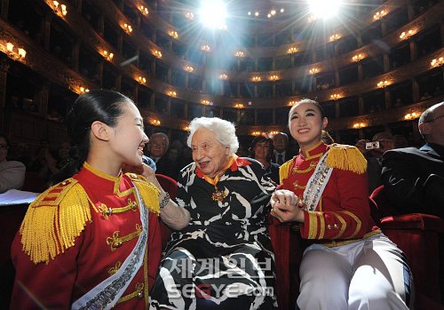 | 공연을 마친 리틀엔젤스 김연수(왼쪽),예현조 단원이 3백년된 로마의 아르젠티나 극장에서 102세의 알마파스쿠토 여사에게 평화의 메달을 걸어드리며 장수를 기원하고 있다. |