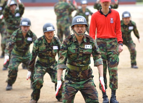 | 오세훈 서울시장(앞)과 시청 간부들이 4일 수도방위사령부 방패교육대 유격훈련장에서 병영체험을 하고 있다. 서울시 제공 |