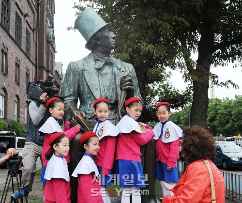| 리틀엔젤스 단원들이 시청 옆에 세워진 안데르센 동상에 올라 현지인의 설명을 듣고 있다. |