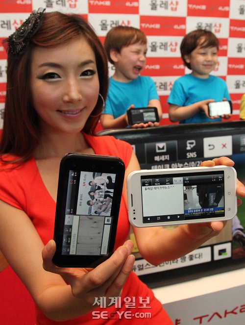KT가 세계최초 1.5GHz 듀얼코어 스마트폰 '테이크 야누스(KM-S200)'출시를 기념하여 20일 서울 광화문 KT 올레스퀘어에서 쌍둥이 고객들이 해당 단말기를 한대 가격으로 두 대를 구매할 수 있는 쌍둥이 원 앤 원 이벤트를 진행하고 있다.