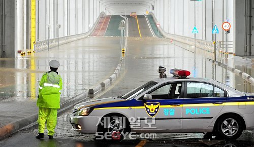 | 잠수교 통제 서울에 호우경보가 내려진 29일 오후 한강 수위가 올라가면서 잠수교가 물에 잠겨 차량 통행이 전면 통제되고 있다. 이제원 기자 |