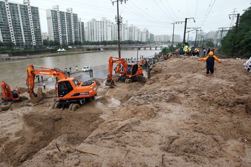 | 산사태 덮친 국철 1호선 서울에 호우경보가 내려진 29일 오후 노원구 월계동 국철 1호선 월계역∼녹천역 구간 공사현장에서 산사태가 발생해 철로와 중랑천변 도로가 토사에 뒤덮여 당국이 굴착기를 동원해 토사를 제거하고 있다. 기상청은 장마전선이 남하하면서 30일에도 경기남부, 충청북부, 강원 영서 남부지방을 중심으로 시간당 30㎜ 이상의 강한 비가 올 것으로 전망했다. 연합뉴스 |