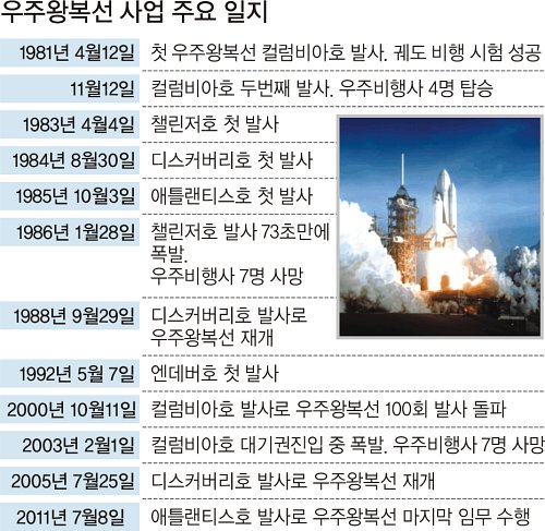 1981년 시작해 정확히 30년간 이어진 우주왕복선 사업에 대해 미국은 더 이상 세금을 쏟아붓지 않기로 했다. 대신 소형 우주선을 개발하는 쪽으로 눈을 돌리고 있다. 미국은 물론 세계 어린이들에게 과학에 대한 상상력을 자극해주었던 이 ‘비행기를 닮은 우주선’은 이제 박물관에 전시될 예정이다. 나사(미 항공우주국)는 앞으로 우주정거장을 오갈 때마다 1인당 5100만달러의 승선료를 내고