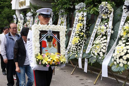 | 5일 오후 해병대 총기사건 희생자들의 합동분향소가 마련된 경기도 성남 국군수도병원 장례식장으로 희생 장병의 영정이 들어서고 있다. |