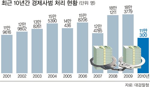 경제사범 급감은 서민 경제 안정화에서 비롯한다는 게 대체적 평가다. 실제로 경제사범은 97년 국제통화기금(IMF) 외환위기 이후 경제·사회 양극화 심화와 신용불량, 개인파산 급증 등에 따라 급증했다가 경제가 회복되기 시작한 98년을 고비로 2001년까지 감소했다.