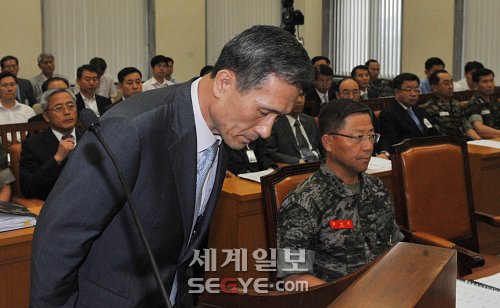 | 고개숙인 국방장관 김관진 국방장관이 7일 국회 국방위원회 긴급회의에 출석해 강화도 해병대 해안소초 총기 사건 보고를 마친 뒤 고개 숙여 인사를 하고 있다. 송원영 기자 |