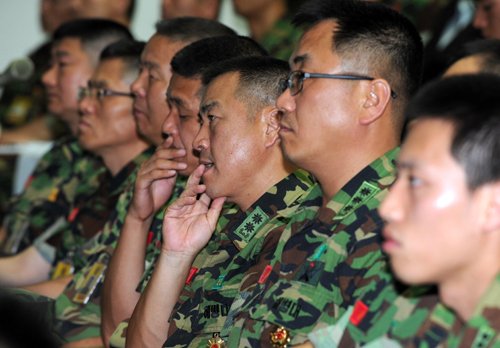 | 쓴소리 경청하는 장교들 추락하는 해병대가 18일 김포 해병대 2사단에서 머리를 맞댔다. 김관진 국방장관에서부터 일개 해병대 사병에 이르기까지 서열을 따지지 않았다. 화두는 총기사건으로 얼룩진 해병대 병영문화를 어떻게 바꿀 것인가였다. 토론회 내내 분위기는 무거웠고 비장함이 느껴졌다. 이날 토론회 도중 기수문화의 폐해를 지적하는 한 병사의 발언을 해병 영관장교들이 침통한 표정으로 경청하고 있다. 김포=사진공동취재단 |
