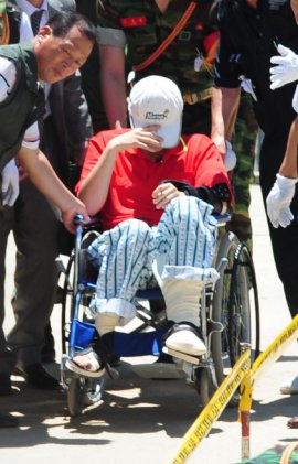 | 강화도 해병 2사단 총기사건 현장검증 해병대 2사단 총기사건 현장검증이 19일 인천시 강화군 길상면 선두리 해병대 소초에서 열렸다. 동료에게 총을 쏜 김모 상병이 현장검증을 마치고 휠체어에 앉아 있다. <연합> |