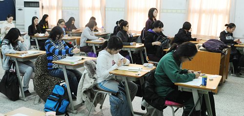 | 2011학년도 대학수학능력시험이 치러진 지난해 11월 18일 서울 종로구 경기상고에서 수험생들이 문제를 풀고 있다 .세계일보 자료사진 |