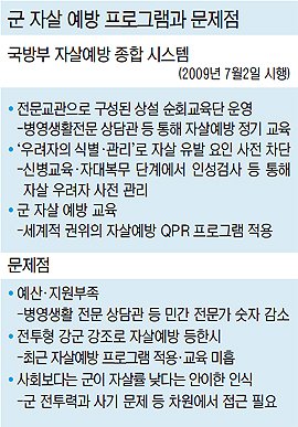 국방부는 2009년 ‘자살예방 종합시스템’을 도입해 군내 최대 사망 사건이자 사고인 자살을 줄이기 위해 노력했다. 훈련병부터 사단장에 이르기까지 분기별 자살예방 교육을 시행하고, 상설순회교육단을 운영해 맞춤형 자살예방 교육도 실시한다. 신병교육 과정과 자대복무 기간 중에는 자살예방 장교와 병영생활 전문상담관을 활용해 자살 우려자를 조기 식별·관리하는 작업도 병행하고 있다.
